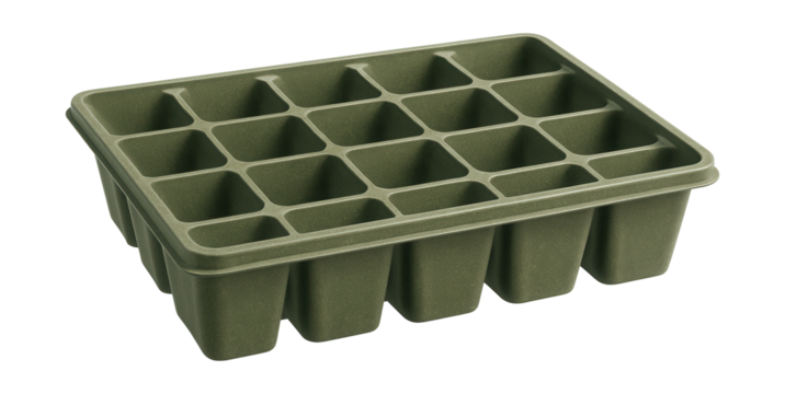 Durable plastic seedling tray, ideal for reuse on an apartment balcony.