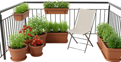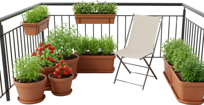 Balcony Garden with Herbs Tomatoes and Folding Chair Relaxing Urban Oasis