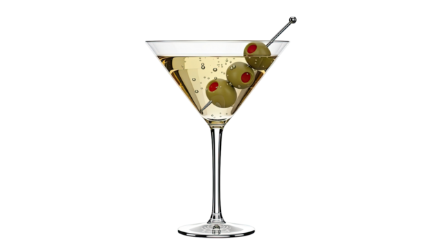 Martini with olives isolated PNG, classic cocktail drink with gin or vodka and olive garnish on transparent background
