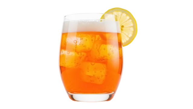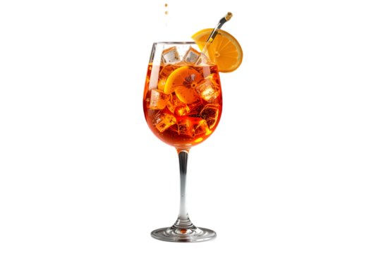 Orange spritz cocktail is garnished with a fresh orange slice and ice cubes, isolated on a transparent background