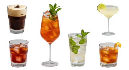 Six meticulously prepared premium alcoholic cocktails including coffee, spritz, margarita, aperitif, mojito, classic, flat lay on transparent background, luxury advertising
