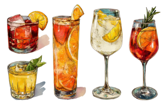 Vibrant watercolor illustrations of Aperol Spritz, Caipirinha, and Old Fashioned cocktails, garnished, on transparent background, hand-painted, concept for beverage advertising