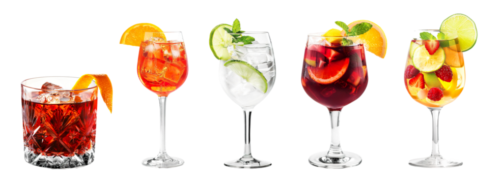 Negroni, Aperol Spritz, Gin Tonic, Red White Sangria cocktail transparent PNG set bundle, isolated background. Bar menu cocktails in old fashioned and wine glass, colorful refreshing drink garnish