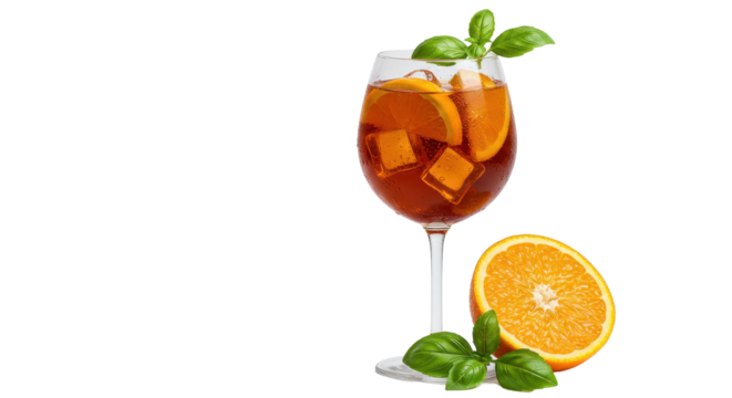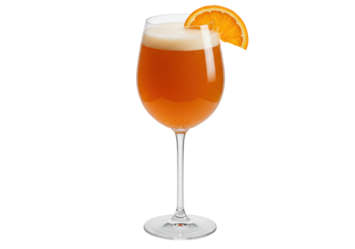 Refreshing Aperol spritz cocktail in wine glass isolated, orange slice garnish on transparent background for summer drink concept