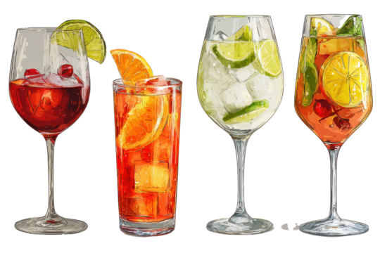 Negroni, Aperol Spritz, Gin Tonic, Red White Sangria cocktail transparent PNG set bundle, isolated background. Bar menu cocktails in old fashioned and wine glass, colorful refreshing drink garnish
