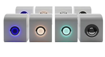 Four identical sleek matte white panels, circular apertures with indigo, amber, turquoise glows, and a dark silver one, on a transparent studio background, horizontal line, concept of energy
