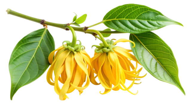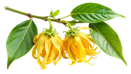 Ylang-Ylang flowers on twig with leaves isolated on white transparent background, cut out png element. Cananga odorata plant. Ylang-Ylang blossom