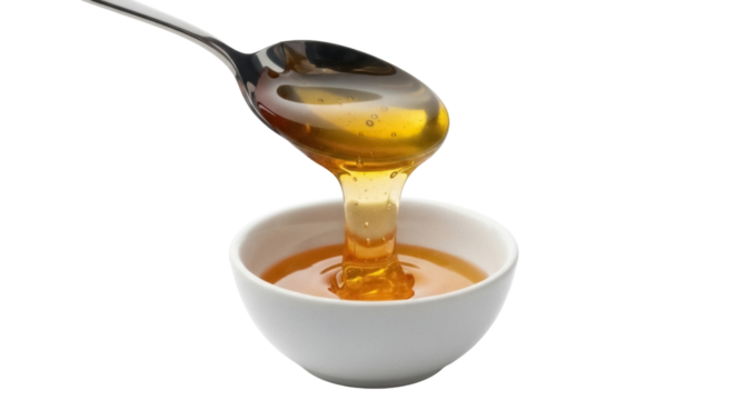 Golden honey dripping from spoon into bowl isolated PNG, sweet natural food on transparent background for healthy eating and cooking