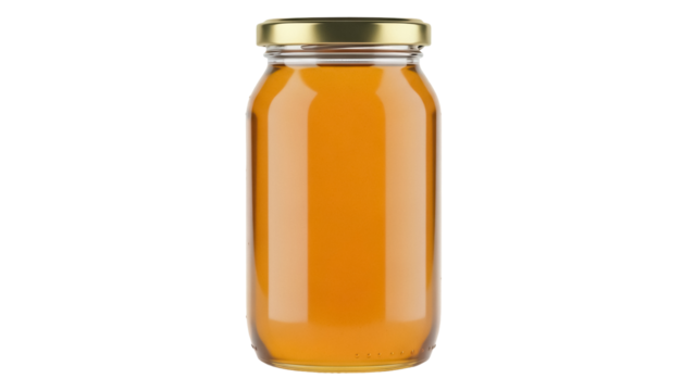 Glass jar with honey isolated PNG on transparent background, golden sweet food product for breakfast and healthy nutrition