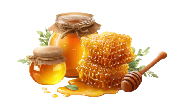 Honey jar and honeycomb displayed on a white background with a wooden dipper and green leaves around