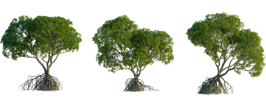 Rhizophora apiculata tree front view, elevation, cutout, 4K PNG, isolate, Three green trees with exposed roots on transparent background