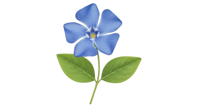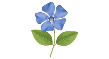 Isolated periwinkle bloom showing soft blue petals and green leaves on a natural stem