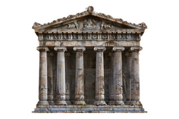 Temple of Apollo in ancient Side (Turkey). Entablature of the ruined temple with stone-cut relief on the frieze. Isolated, white background. History, art or architecture concept