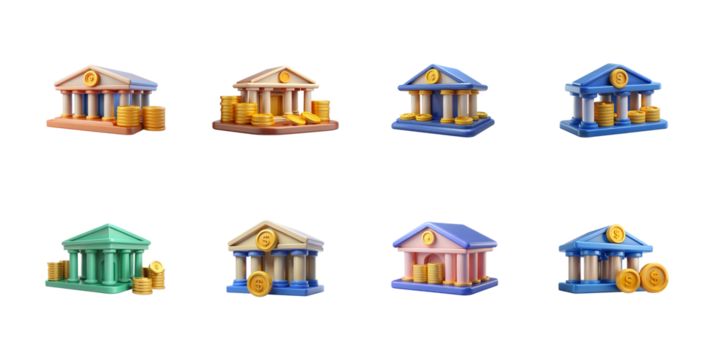 Collection of eight colorful 3d isometric bank and money icons set for financial app design on transparent background