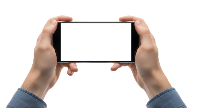 Hands holding Smartphones with Black Screen Mobile Phone Mockup Template App UI UX Design on transparent background