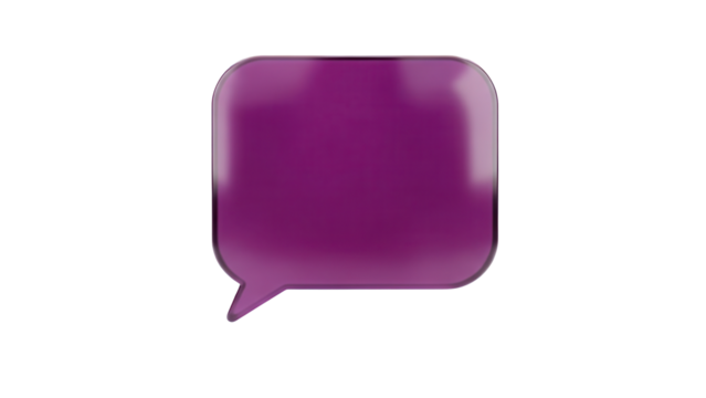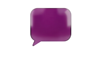 Frosted deep violet glassmorphism message bubble icon floating isolated on a clean white background for modern app UI design with soft light reflections.