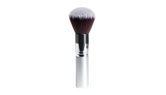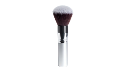 Close-up of a powder brush, featuring a fluffy white and brown head with a metal handle