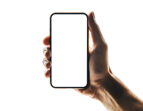 Hand holding smartphone mockup as png photo with blank screen isolated on white background. mobile phone hand mockup, studio style