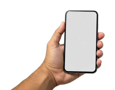 Hand holding smartphone with blank screen isolated on transparent background, perfect for showcasing app or mobile website design