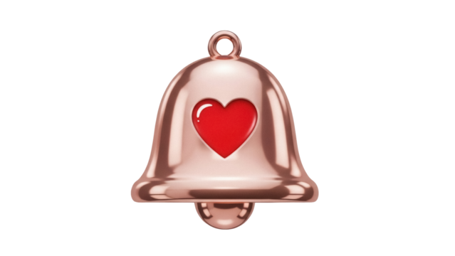 Rose gold notification bell with heart isolated PNG, social media reminder icon on transparent background for app design and user interface