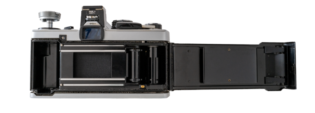 appareil photo argentique, vue dos ouvert, sur fond transparent