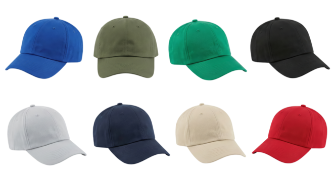 Assortment of versatile baseball caps in various vibrant and neutral colors isolated, on clear