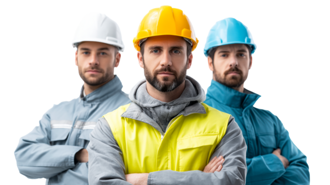 Confident engineer with hard hat and ear protection on transparent background