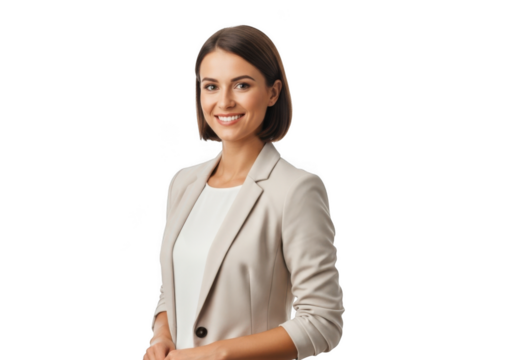 Professional young woman in a light colored blazer smiling confidently isolated on transparent background