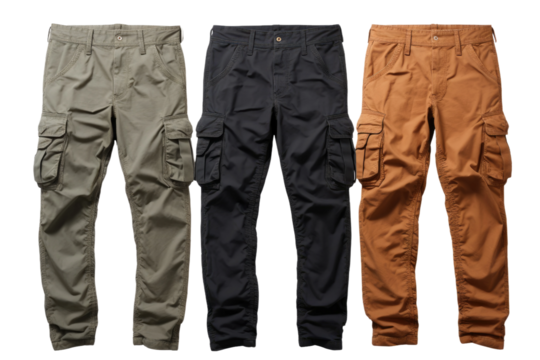 Triad of Vibrant Cargo: Three Mens Cargo Pants in Different Colors on White or PNG Transparent Background.