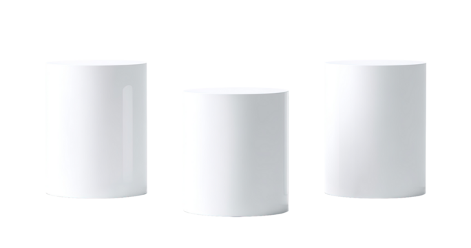 Three simple, white cylinders, side-by-side.  They appear smooth, and are identical in shape, but subtly different in their apparent perspective, giving the illusion of depth