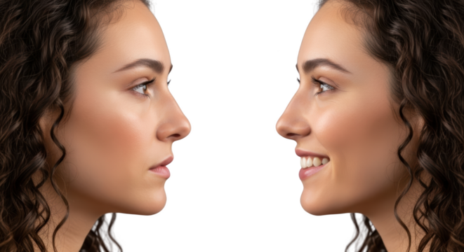 Side profiles of a young woman's face showing a before and after transformation of her nose isolate beauty