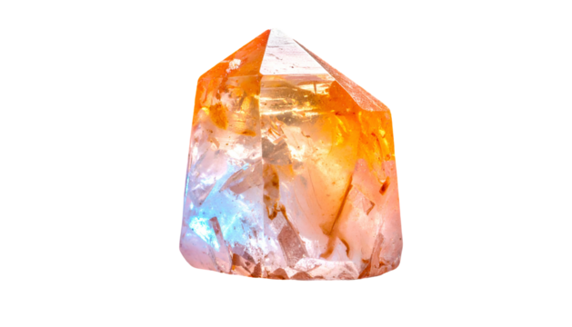 A faceted crystal is illuminated with gradients of orange, yellow, and blue, creating a vibrant, luminous appearance against a black background