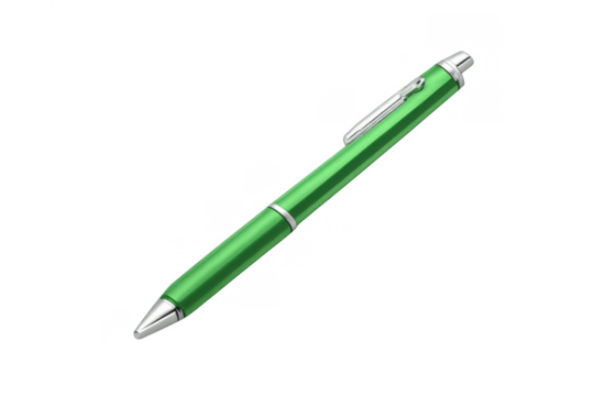 Green metallic ballpoint pen featuring a silver clip and tip, appearing as a professional stationery item. Transparent background