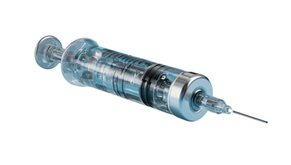 Clear, transparent syringe with needle, appearing on a solid black background, rendered