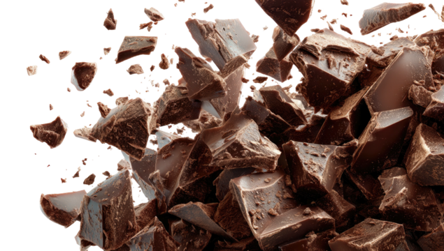 Close-up of dark, fragmented confectionery, brown hues against a black backdrop, appearing to burst outward