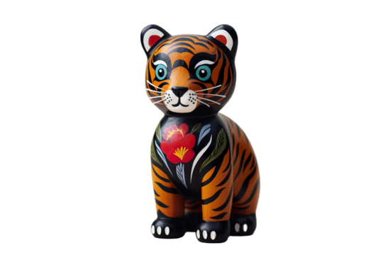 12 animal designations PNG: a figurine of a lovely Tiger, Very cute with colorful designs, Chinese traditional folk mud dog art style, in the style of woodcarvings