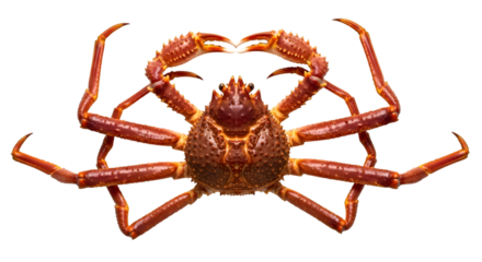 A large orange spiny king crab with prominent claws and long legs isolated on transparent background