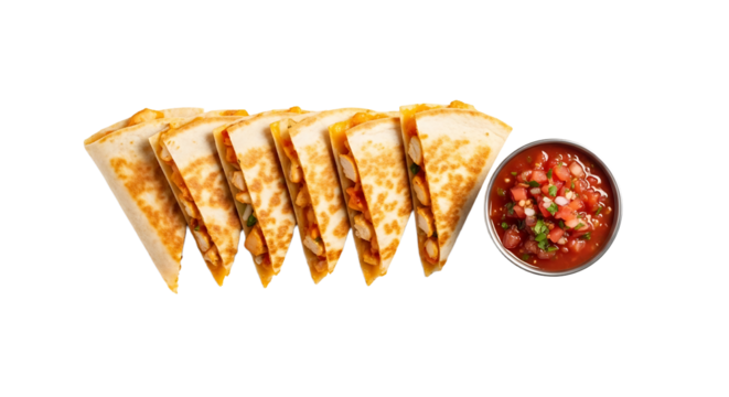 A tantalizing spread of golden quesadilla slices paired with vibrant, fresh salsa, perfect for any occasion, so appetizing.