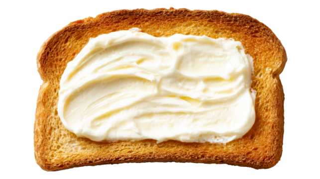 Golden toasted bread slice generously spread with creamy butter, perfect for breakfast or snack food themes, offering delicious comfort and appetite appeal for culinary and lifestyle