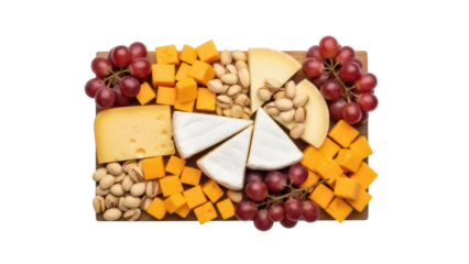 Cheese board with grapes and pistachios isolated PNG, gourmet appetizer platter for wine and cheese party on transparent background