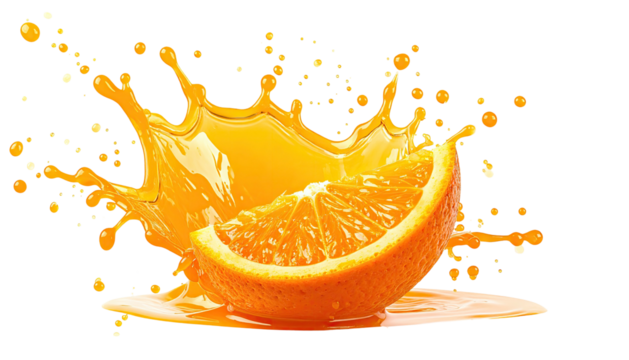 Orange slice beside a splash of bright orange liquid