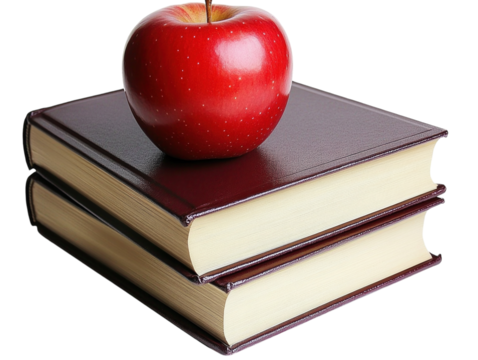 A stack of hardcover books with a red apple placed on top isolated on transparent background