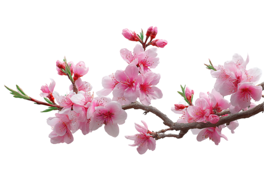 Isolated cherry blossom branch with blooming pink flowers on a white background
