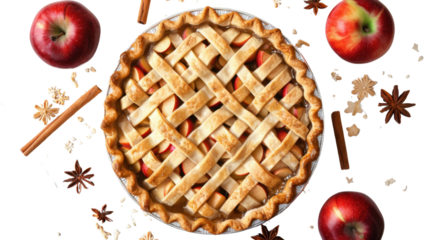 Delicious homemade apple pie decorated with cinnamon, anise and apples on transparent background