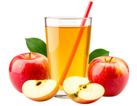 Fresh apple juice in a glass with a whole apple, a healthy and refreshing fruit drink isolated on white background. png