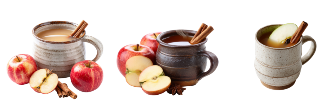 a cup of hot apple cider with cinnamon sticks, steam rising, isolated on transparent background