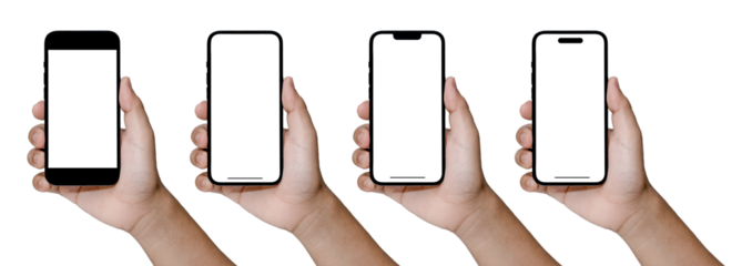 Berlin, Germany June 01 2023 Hands holding mobile phone screen mockups, blank smartphone mock-ups set, isolated on white