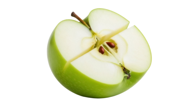 Half of a green apple with cut slices isolated PNG, fresh fruit on transparent background for healthy eating and food design