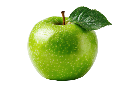 Fresh green apple with water droplets isolated PNG, healthy fruit with leaf on transparent background for food and nutrition concepts