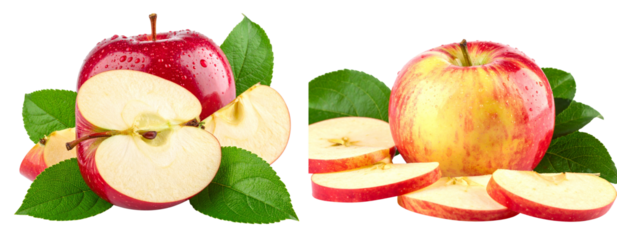 Shiny red apple with green leaf isolated PNG on transparent background, fresh fruit for healthy eating and food design